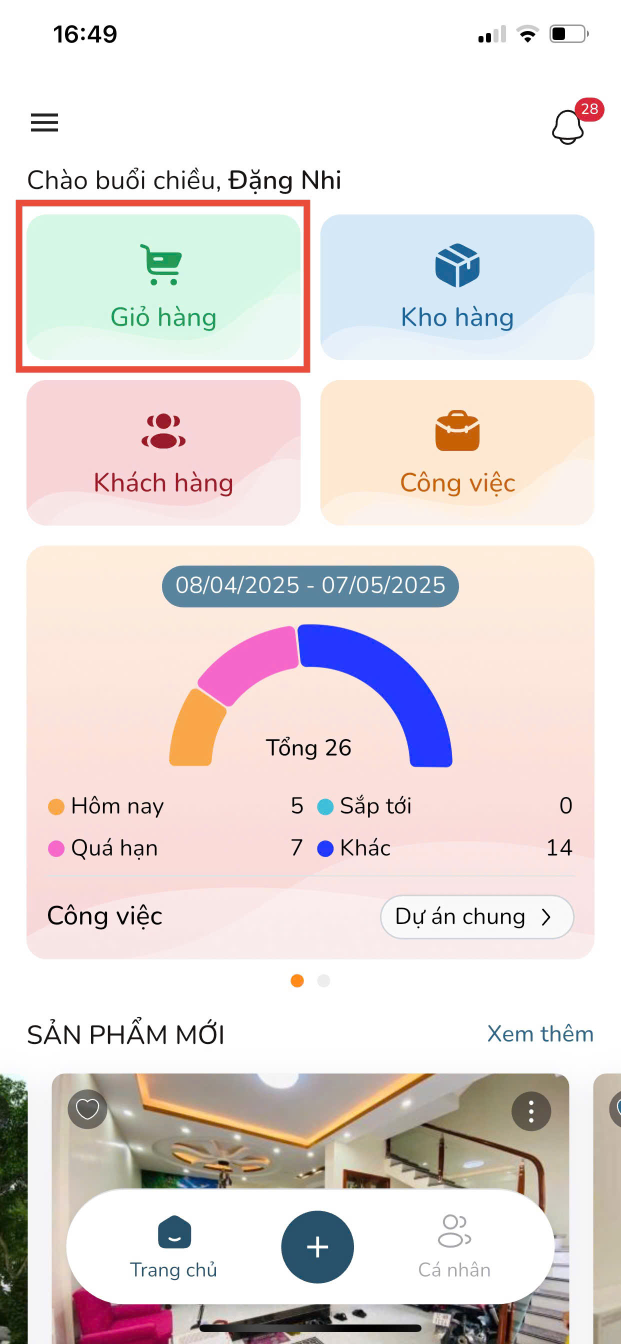 Bước 3: Tại màn hình Trang chủ, nhấn vào mục Giỏ hàng.