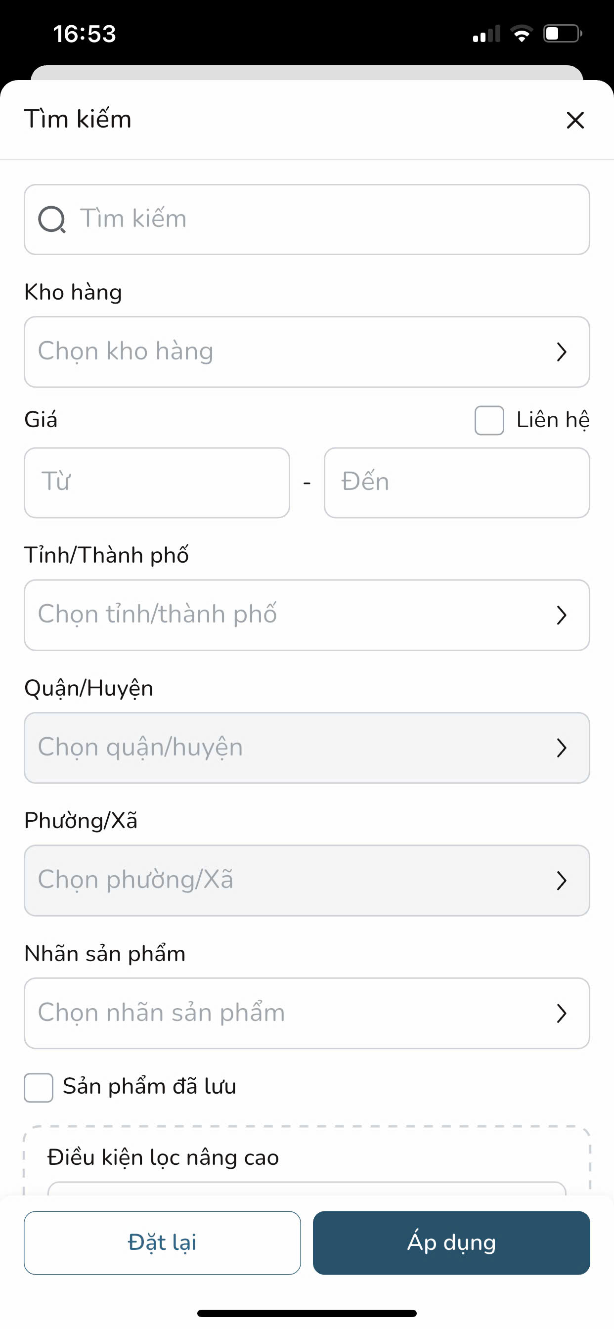 Bước 6: Sau khi nhập/ chọn các điều kiện, bạn nhấn nút Áp dụng để tìm kiếm sản phẩm trong giỏ hàng theo điều kiện đã áp dụng. Bạn có thể nhấn nút Đặt lại để xóa các điều kiện đã áp dụng.
