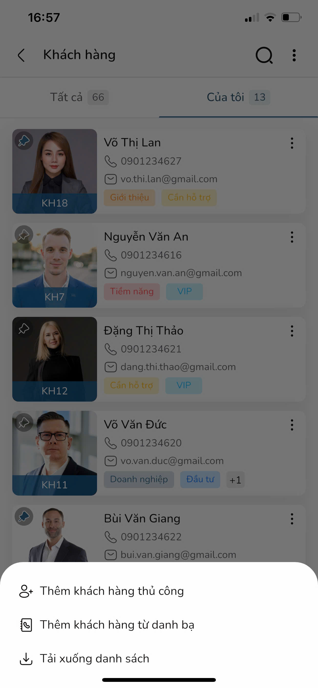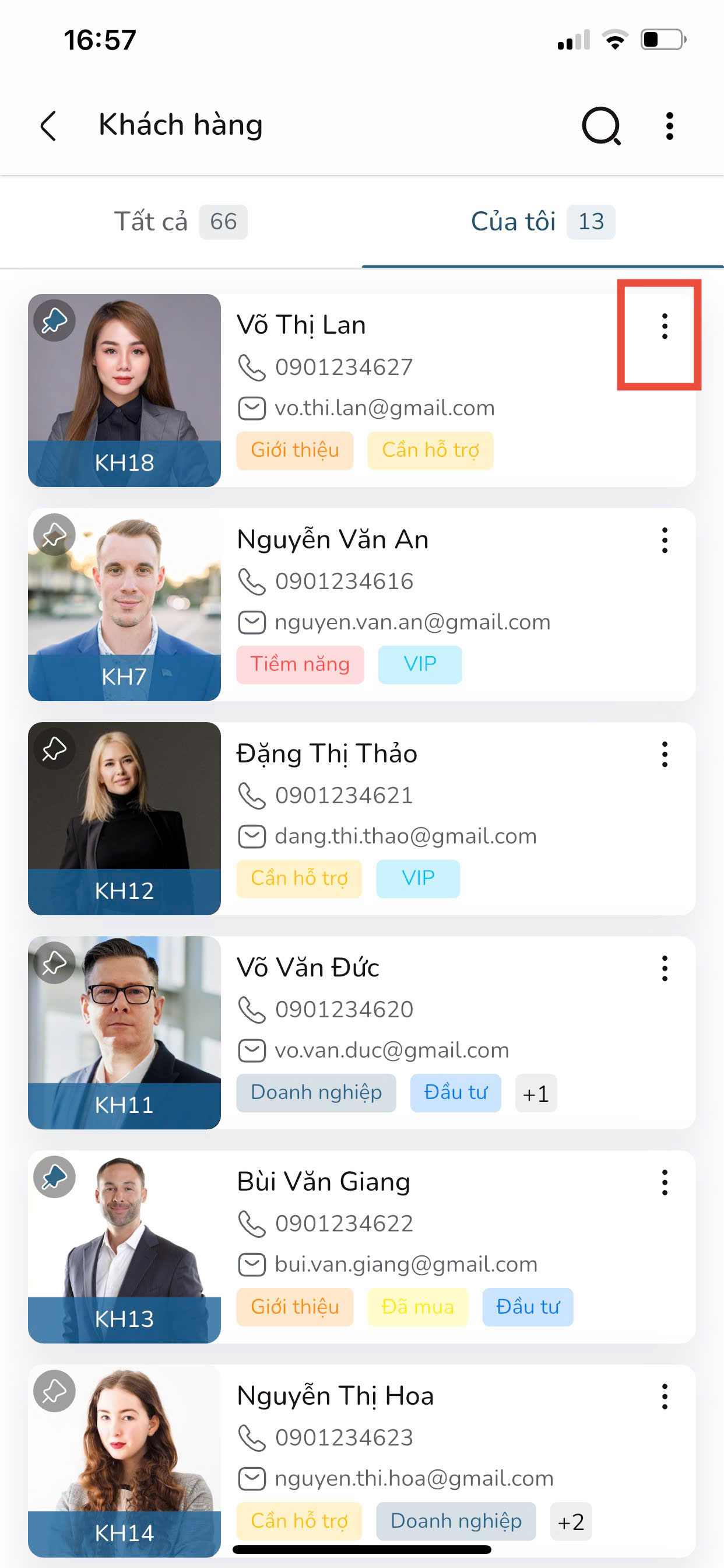 Bước 4: Tại màn hình Danh sách khách hàng, nhấn vào biểu tượng “…” ở 01 dữ liệu khách hàng bất kỳ.