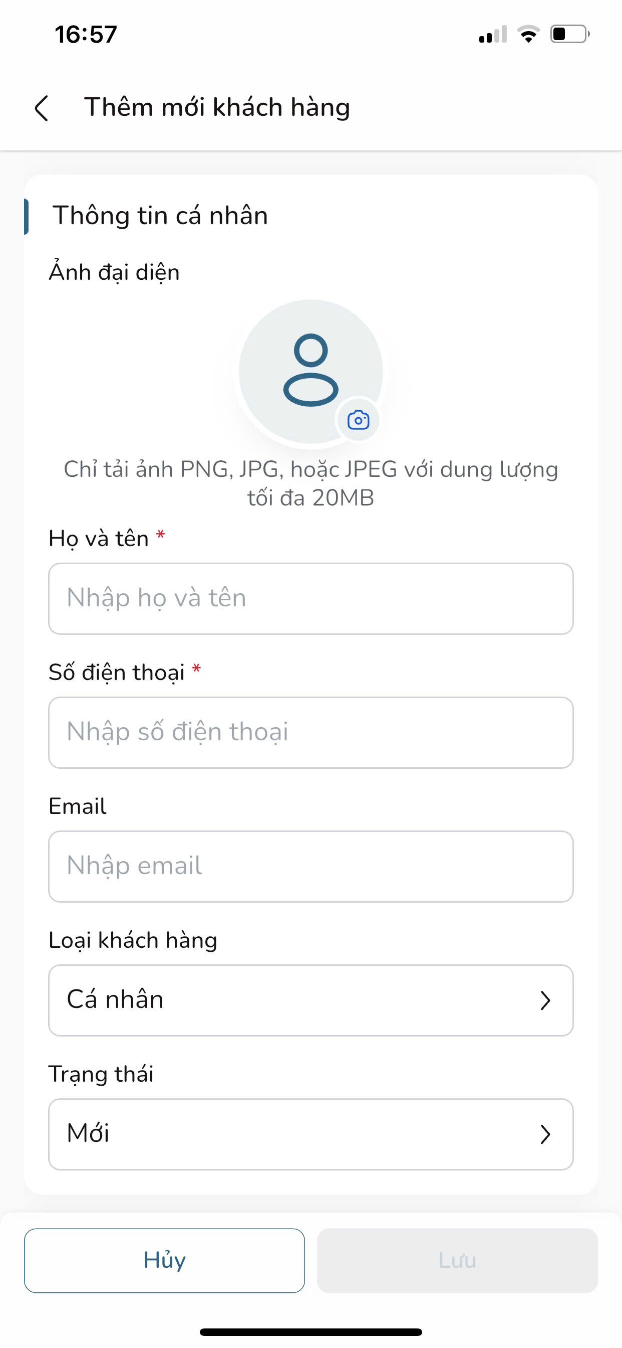 Bước 5: Tại màn hình Thêm mới khách hàng, nhập đầy đủ các thông tin bắt buộc và thông tin khác của khách hàng.