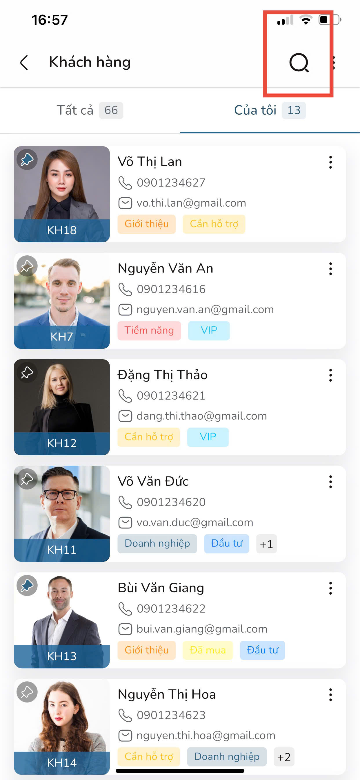 Bước 4: Tại màn hình Danh sách Khách hàng, nhấn vào biểu tượng Tìm kiếm.