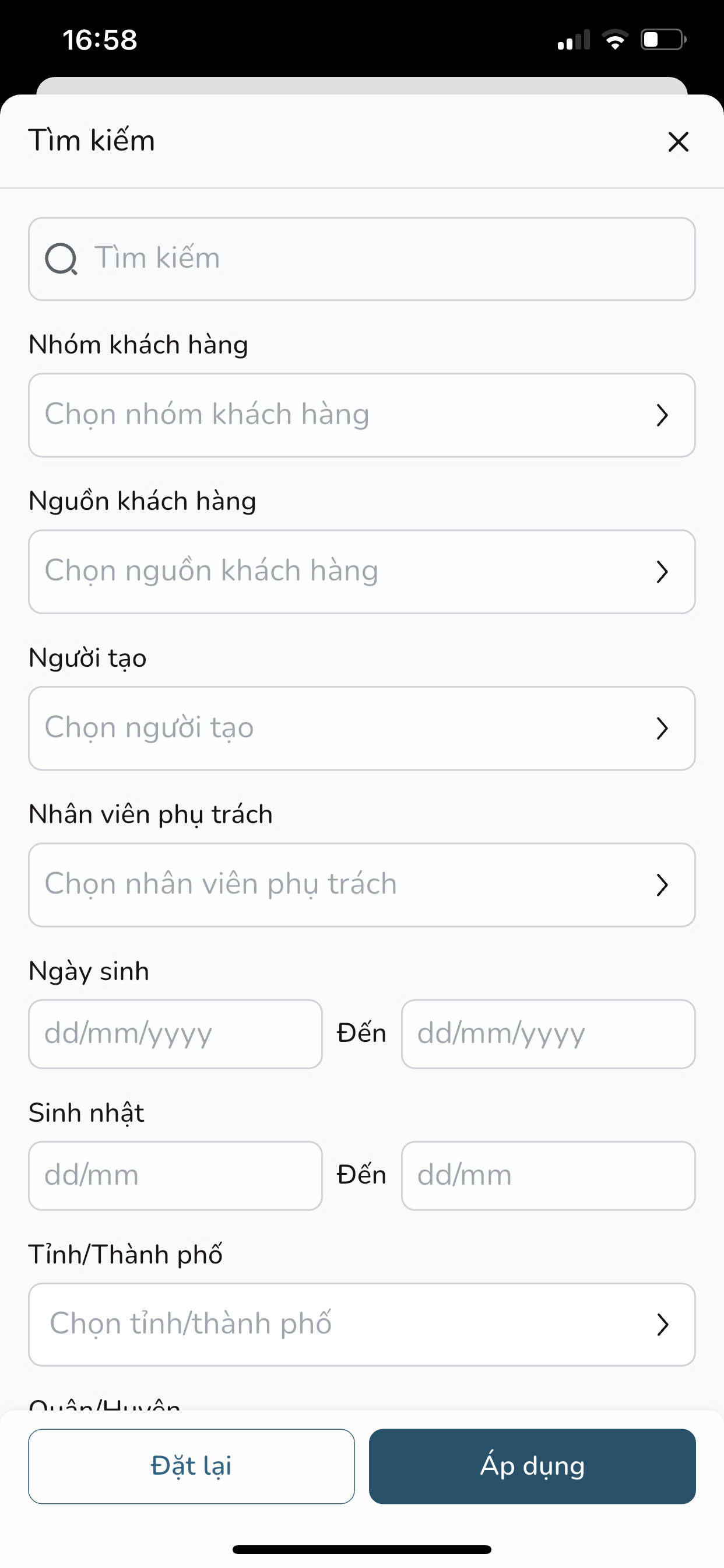 Bước 5: Tại màn hình Tìm kiếm, bạn nhập và chọn các điều kiện cần tìm kiếm, bao gồm: Mã khách hàng, Tên khách hàng, Số điện thoại, Nhóm khách hàng, Nguồn khách hàng, Người tạo, Nhân viên phụ trách, Tags, Trạng thái ghim, Trạng thái, Ngày sinh, Sinh nhật, Tỉnh/ Thành phố, Quận/ Huyện, Phường/ Xã.