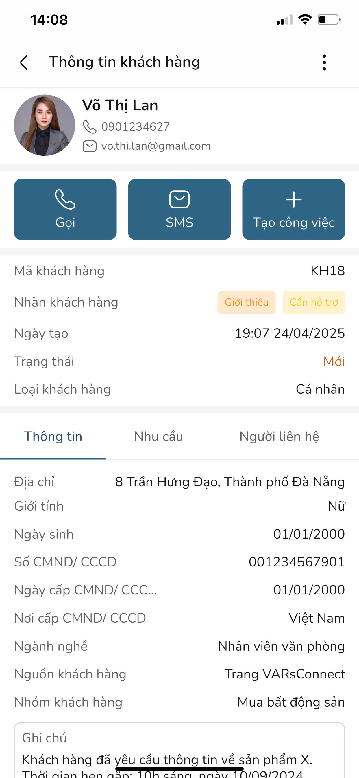 Bước 5: Bạn có thể xem thông tin chi tiết của khách hàng, bao gồm: Thông tin chung của khách hàng, danh sách sản phẩm quan tâm, công việc liên quan, log khách hàng.